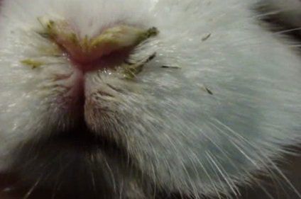 Tünetek: Ferde fejtartás, kellemetlen szagú fül, A nyuszi fülében sárgás váladék (genny) gyülemlik fel, Gubbaszt és nincs étvágya